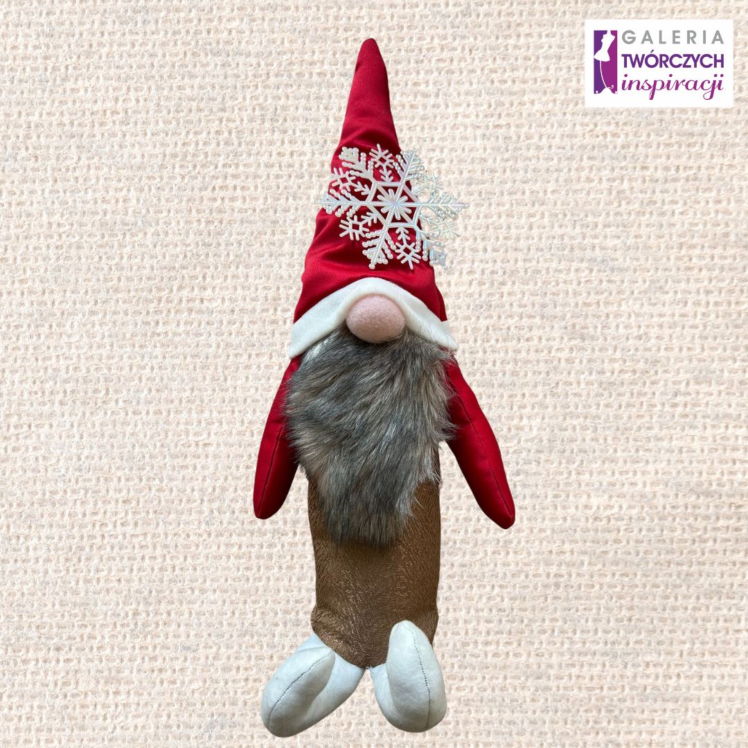 Uroczy skrzat w świątecznym wydaniu, z charakterystyczną wysoką czerwoną czapką ozdobioną śnieżynką oraz miękką, puszystą brodą. Ciepła kolorystyka i starannie dobrane detale sprawiają, że doskonale wpisuje się w bożonarodzeniowy klimat.
