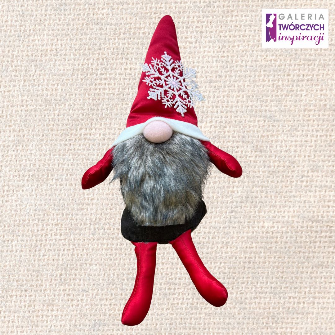 Uroczy skrzat w świątecznym wydaniu, z charakterystyczną wysoką czerwoną czapką ozdobioną śnieżynką oraz miękką, puszystą brodą. Ciepła kolorystyka i starannie dobrane detale sprawiają, że doskonale wpisuje się w bożonarodzeniowy klimat.