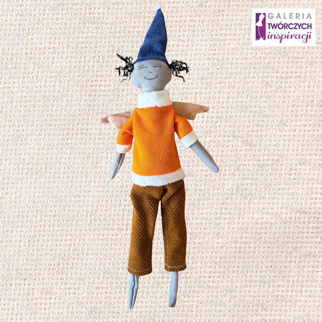 Urocza lalka tekstylna w formie skrzata z delikatnymi skrzydełkami i kolorowym strojem. Jej pogodny wyraz twarzy oraz starannie dobrane detale nadają jej wyjątkowego, przyjaznego charakteru. Idealna jako zabawka dla dziecka, dekoracja pokoju lub oryginalny prezent.