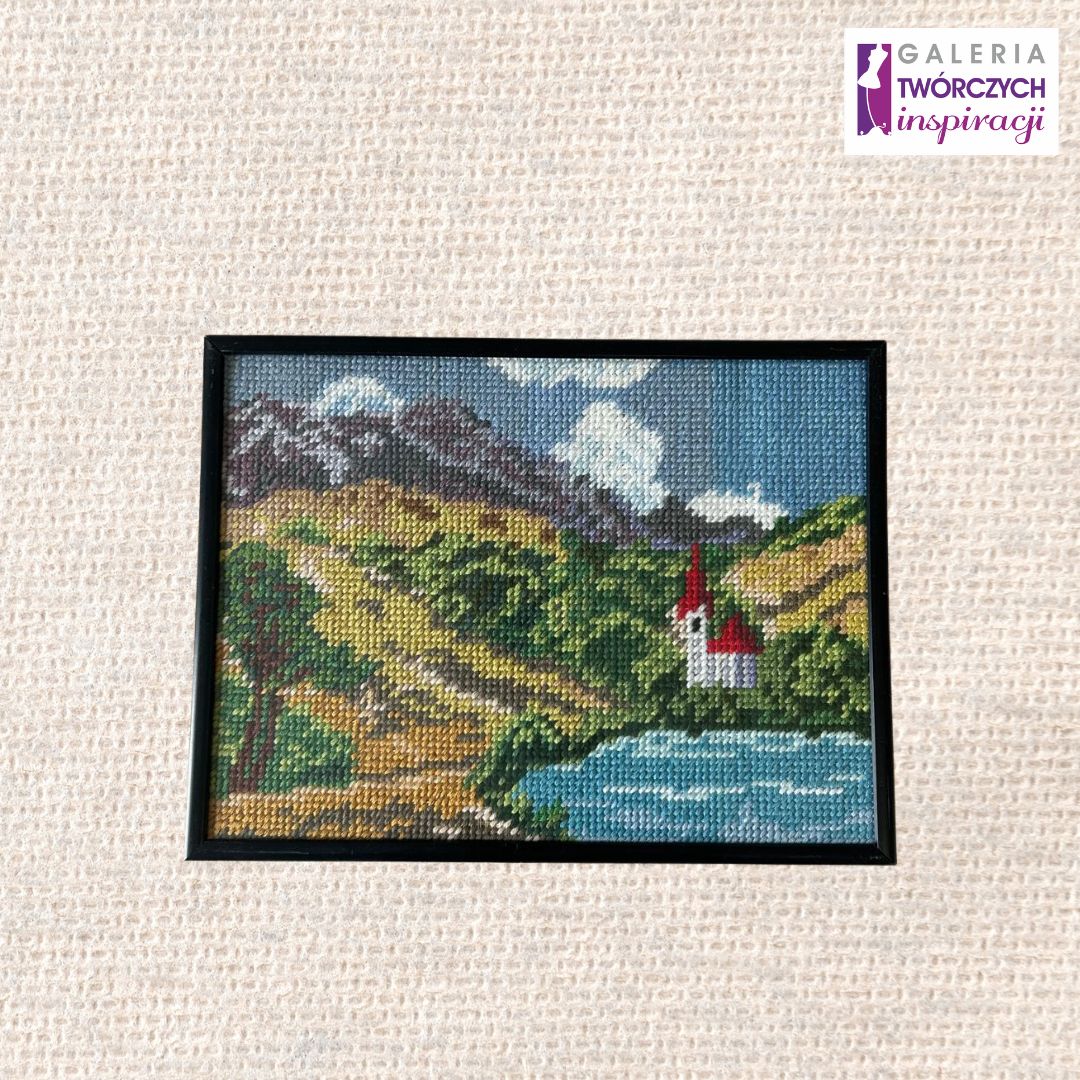 Ręcznie wykonany obraz haftowany przedstawiający malowniczy krajobraz z jeziorem, górami i niewielkim kościółkiem. Praca została wykonana techniką haftu krzyżykowego z dbałością o detale oraz harmonijne przejścia kolorystyczne. Całość oprawiona jest w klasyczną ramkę, dzięki czemu obraz jest gotowy do powieszenia.